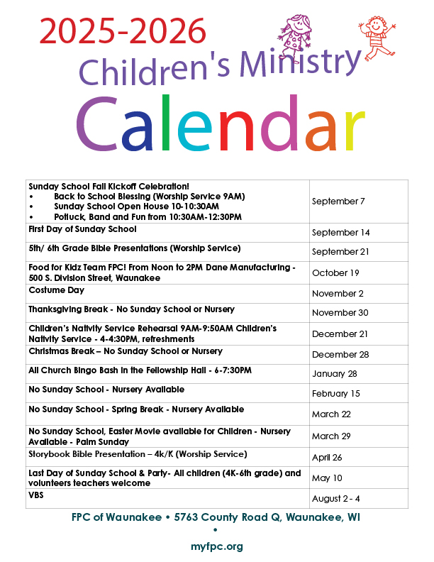 Get ready for an exciting year with FPC of Waunakee’s Children’s Ministry! Our calendar is packed with fun, faith-filled activities that your kids will love. From hands-on Bible lessons and creative arts and crafts to special events and holiday celebrations, there’s always something awesome happening.